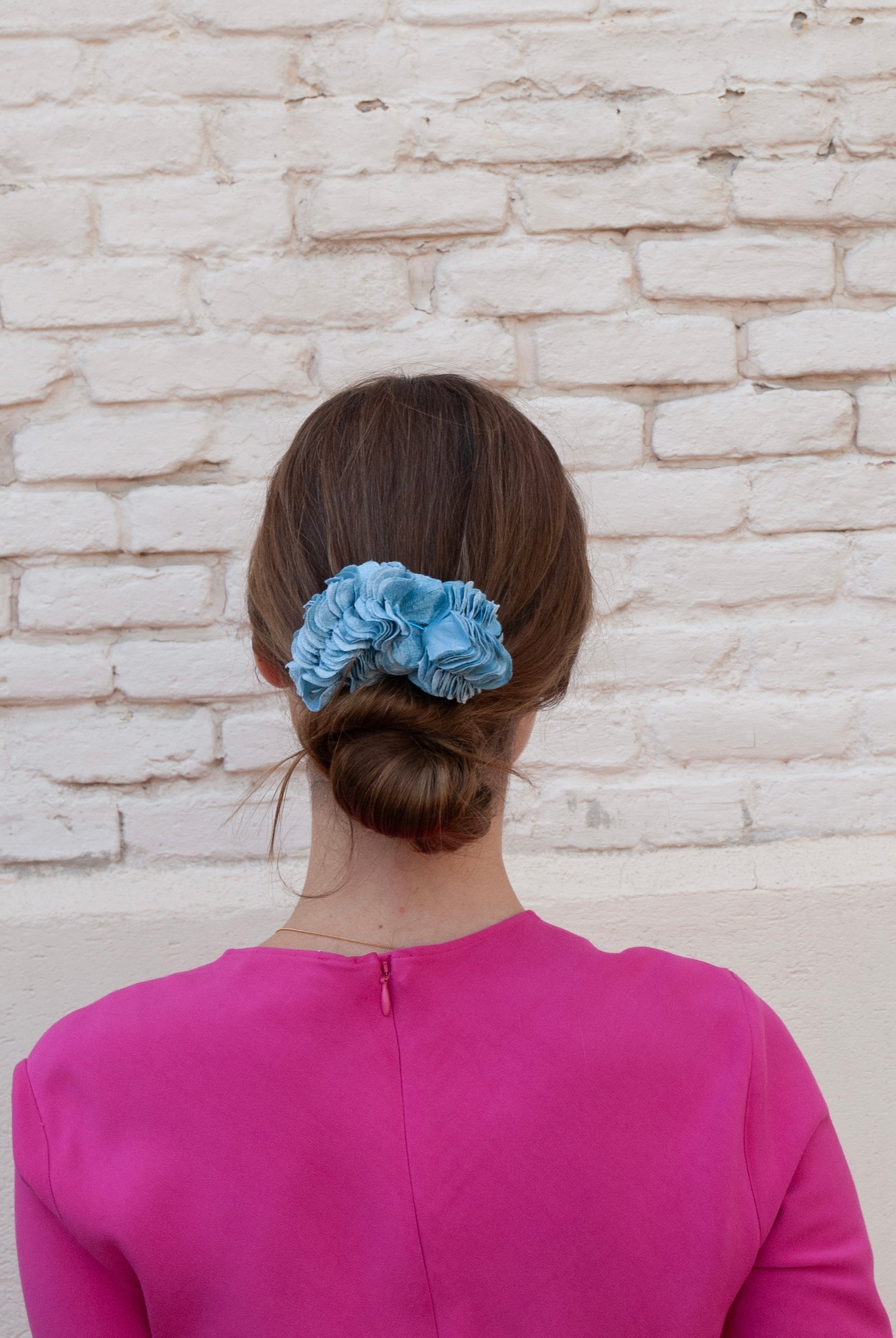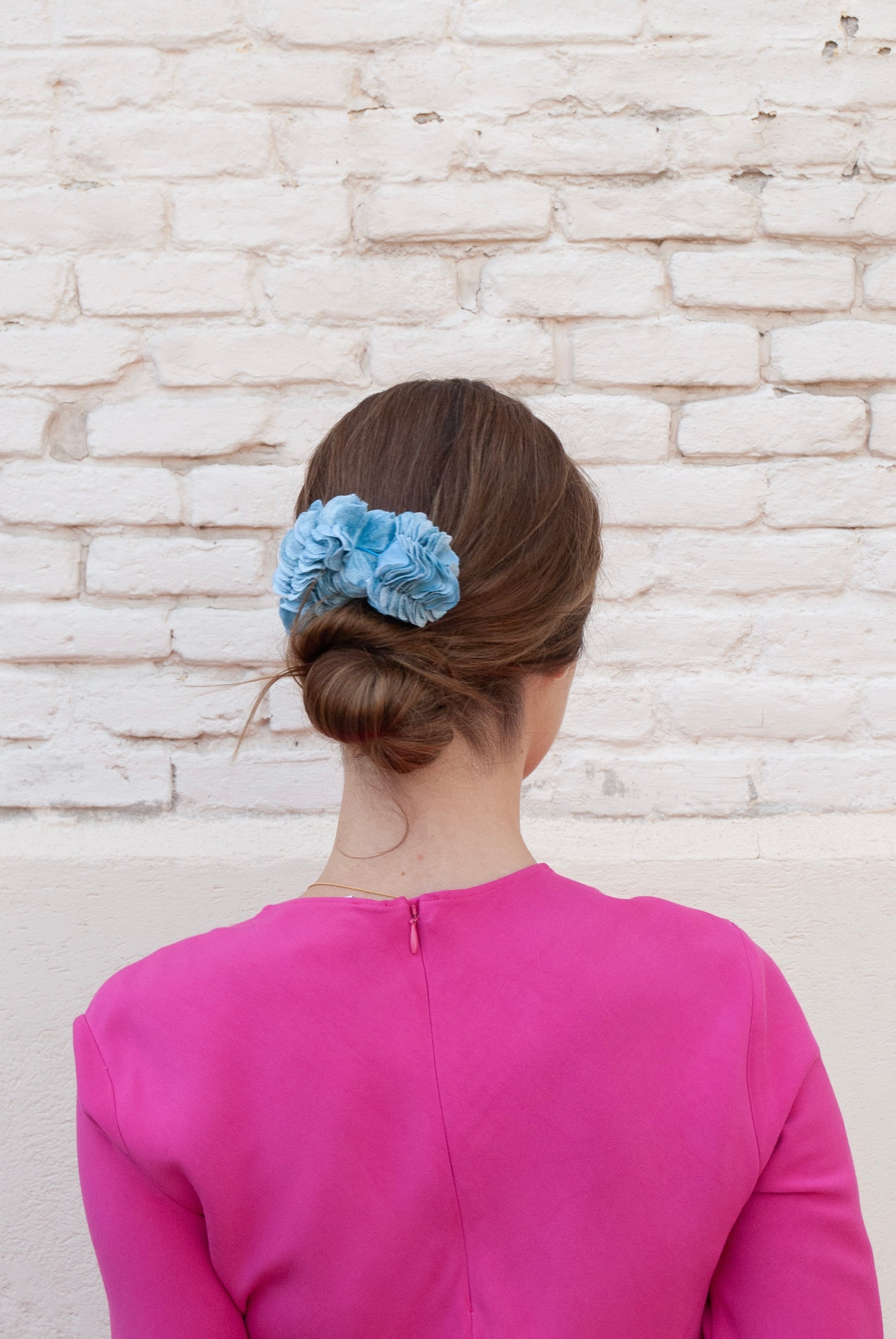 Tocado de hortensias color azul. Adorno de pétalos de terciopelo ideal para adornar un moño. Está alambrado para facilitar su colocación. Hecho a mano en Madrid.