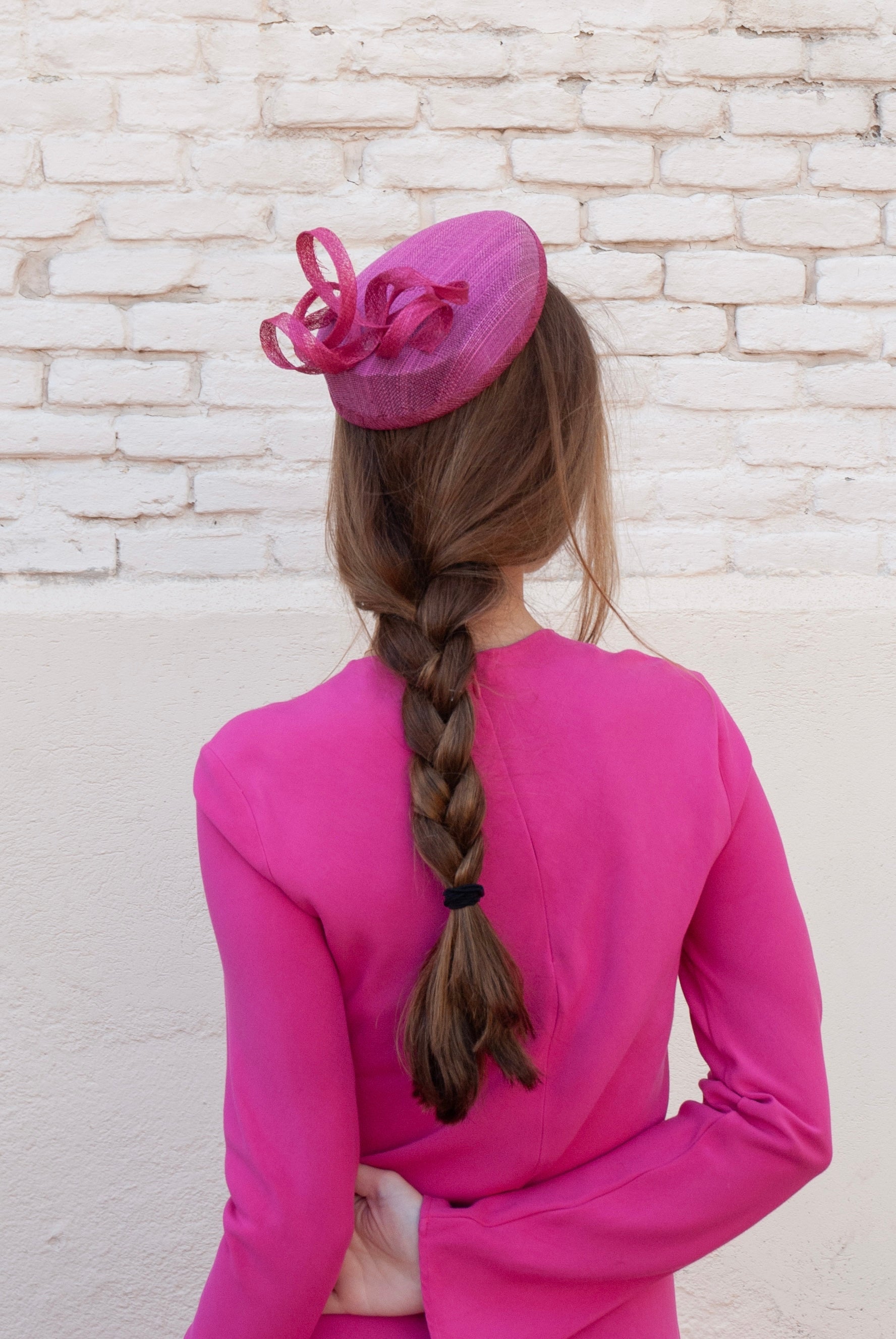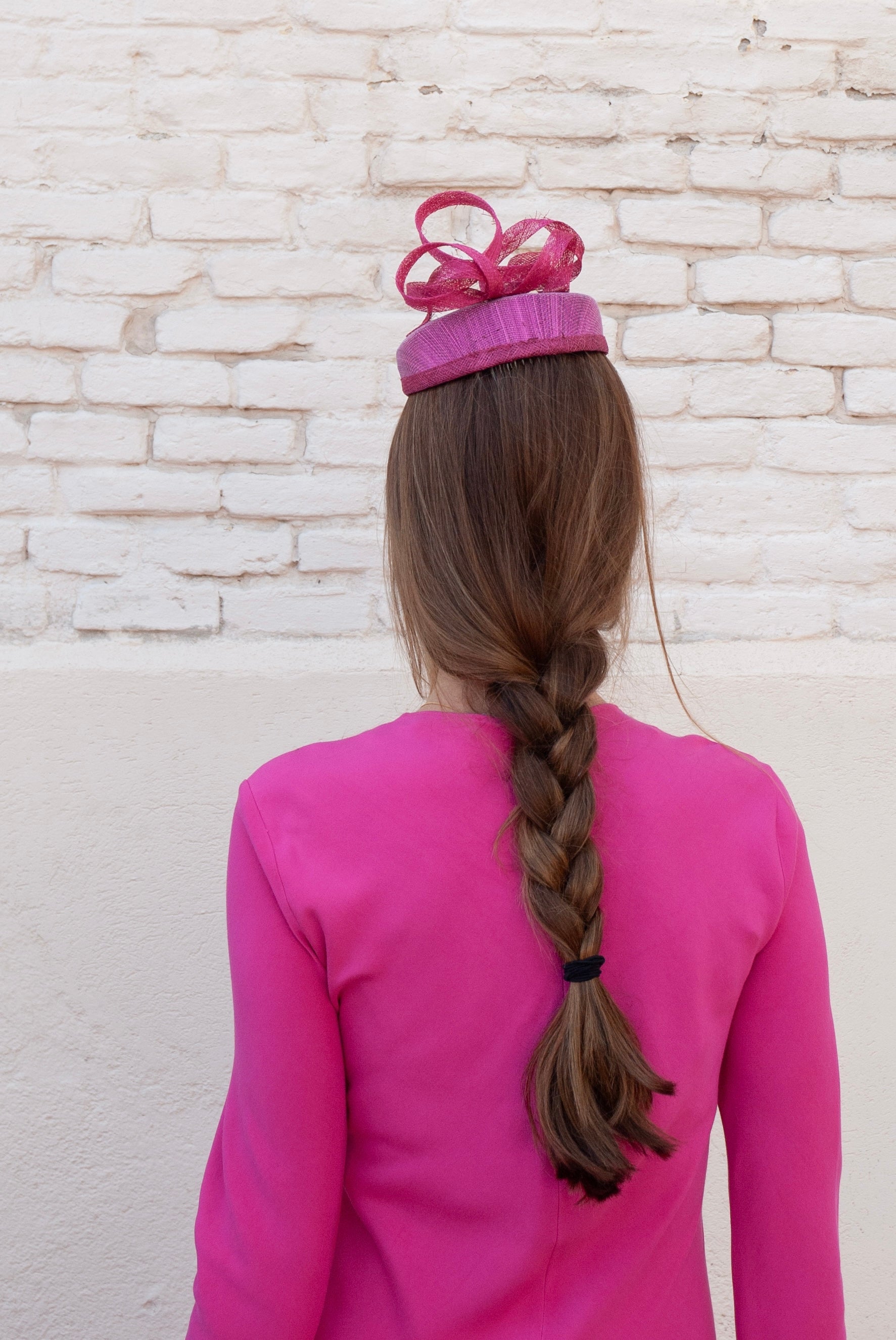 El casquete o pillbox Romina buganvilla de sinamay en forma de pico y adornado con un lazo desestructurado de sinamay, que aporta presencia y sofisticación sin perder naturalidad. Confeccionado artesanalmente en España, el es perfecto para bodas de día o de tarde, comuniones y celebraciones donde cada detalle marca la diferencia