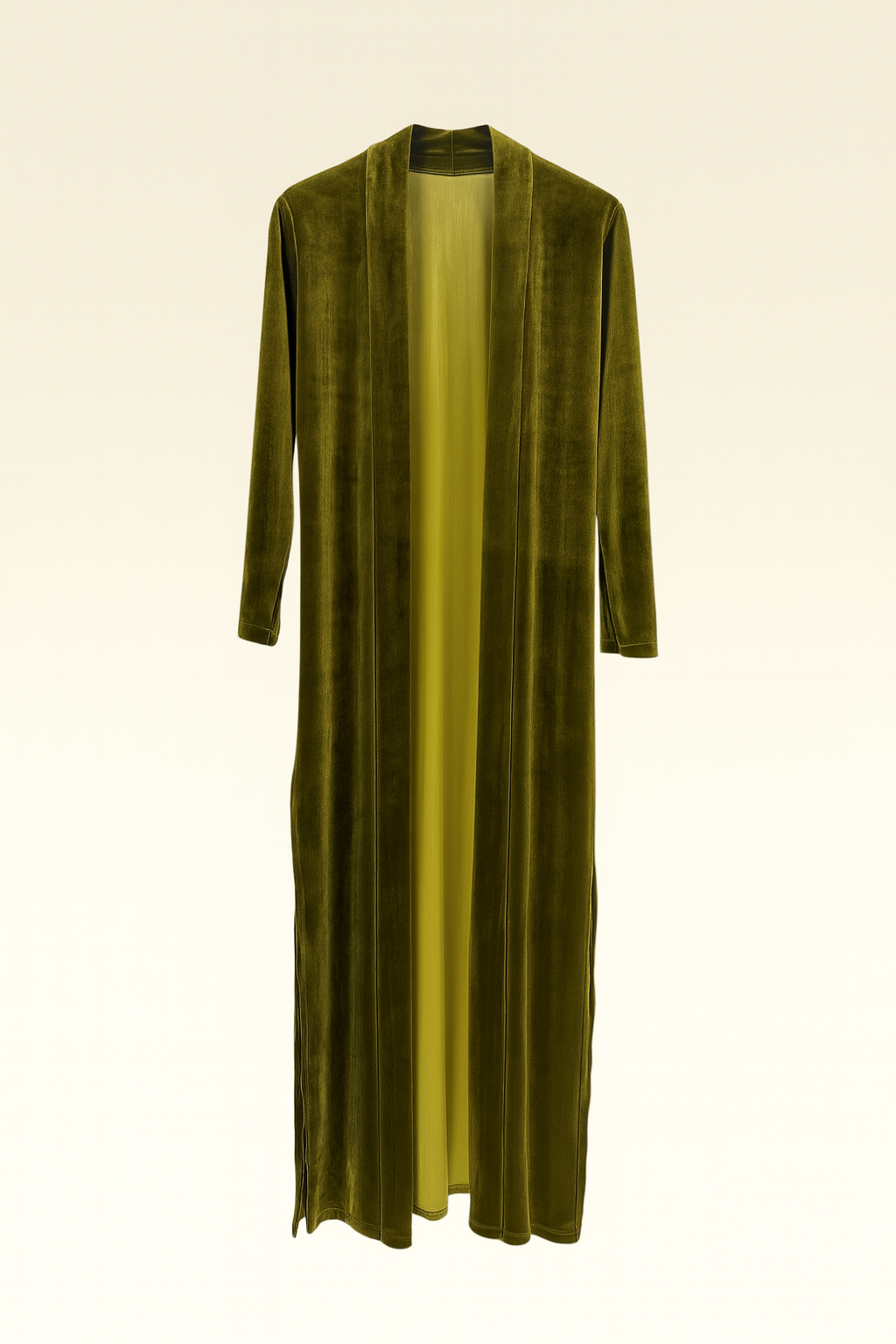 Es un abrigo largo de terciopelo, con un diseño fluido y sofisticado.