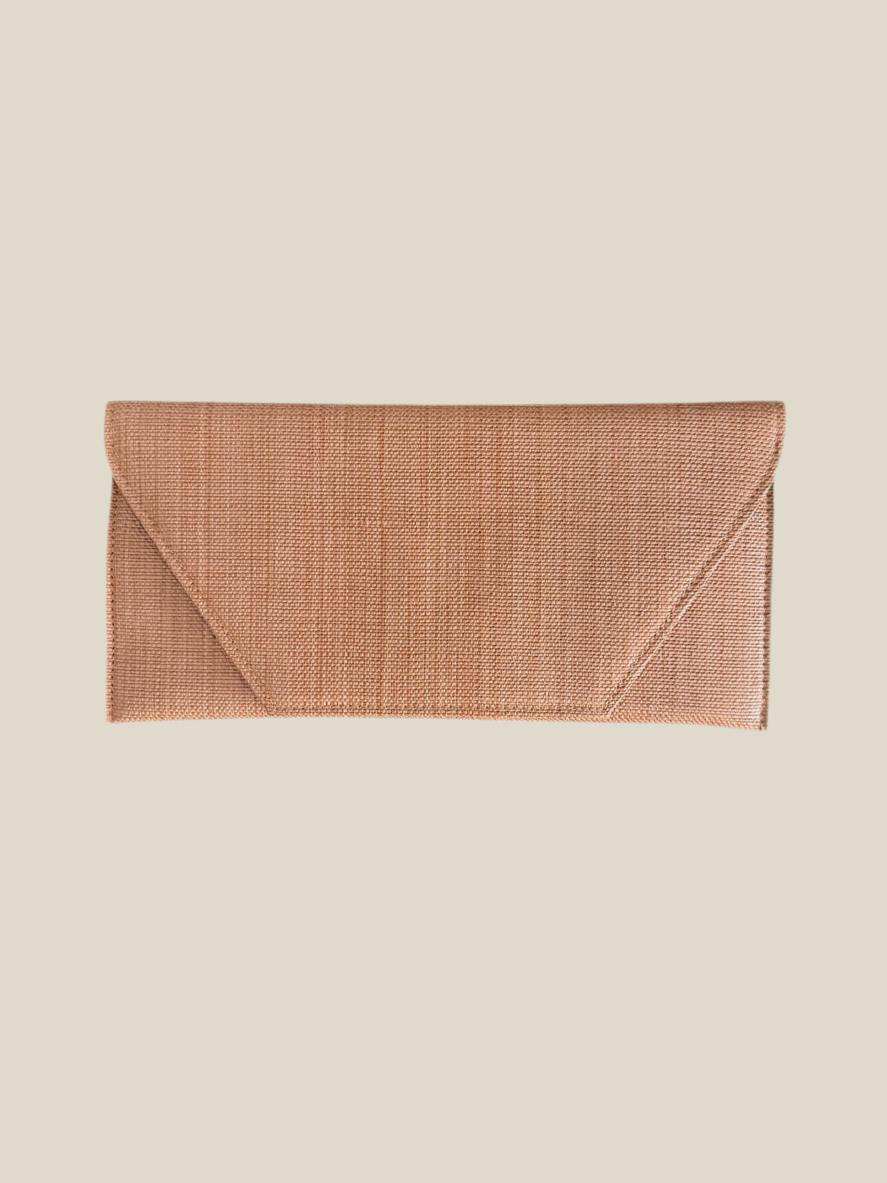Bolso de rafia en forma de sobre. Mide 30 x 16 cm. Tiene cadena para poder llevar colgado del hombro.