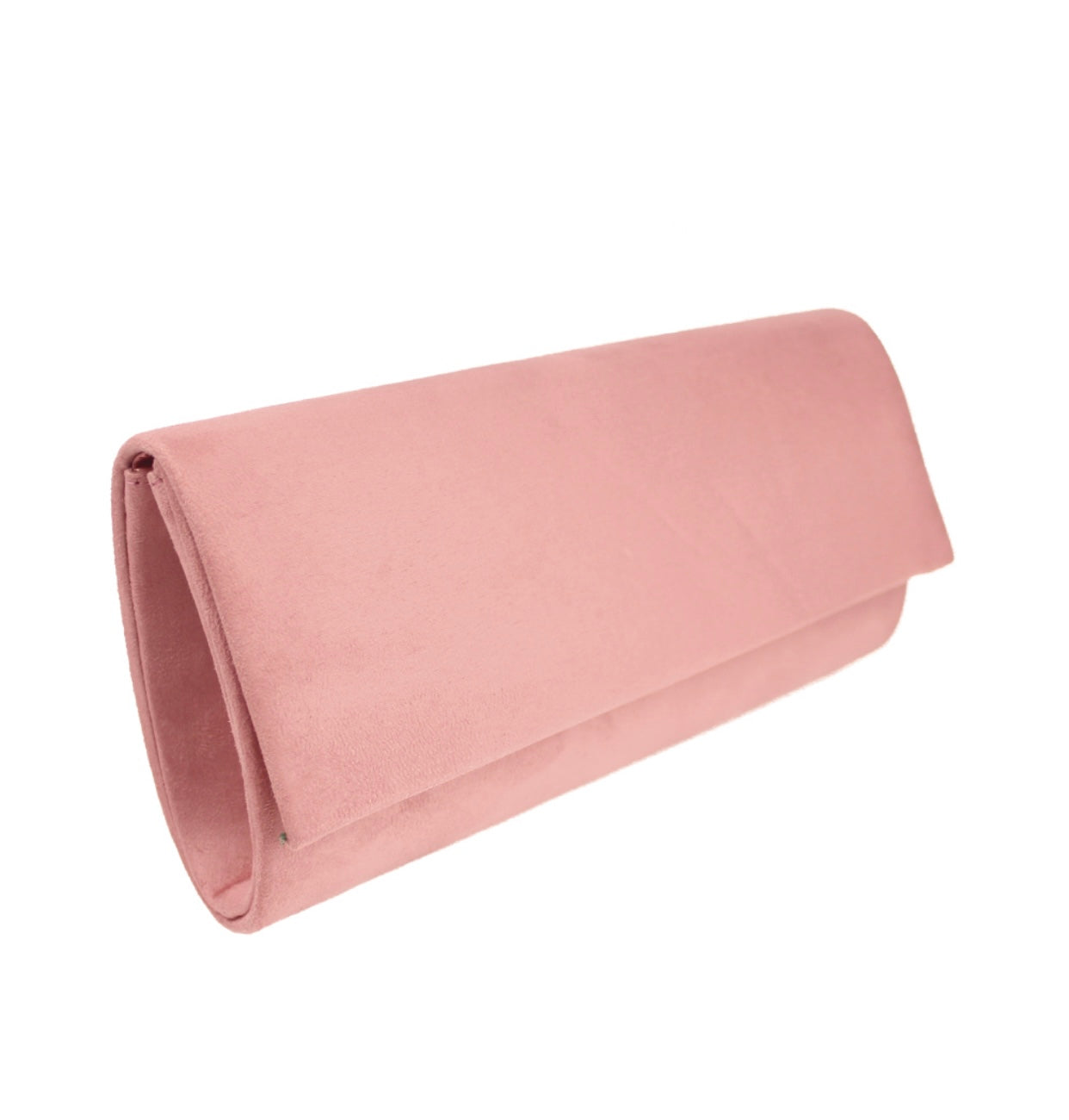 Bolso de fiesta de antelina nude. Mide 22 x 11 cm. Tiene cadena para poder llevar colgado del hombro.
