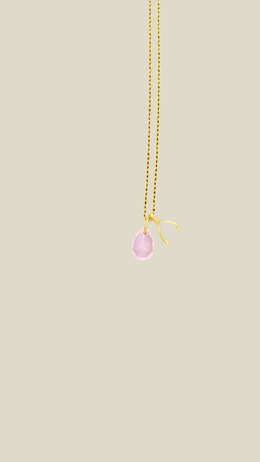 Colgante de plata bañada en oro con lágrima de videario rosa y hueso de la suerte de plata bañada en oro