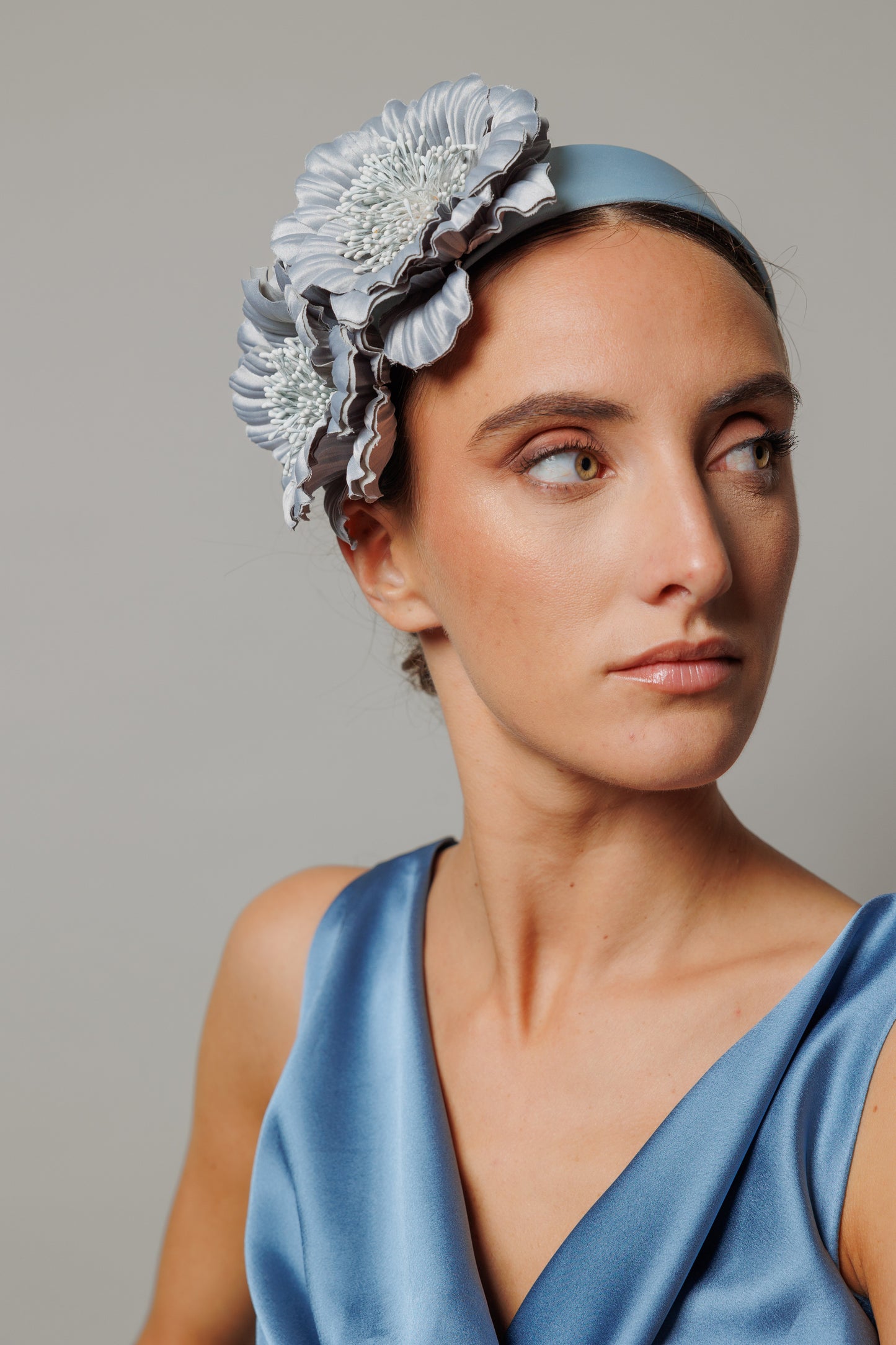 Diadema de satén con dos flores en un lateral. Hecha a mano en España. Se puede añadir velo