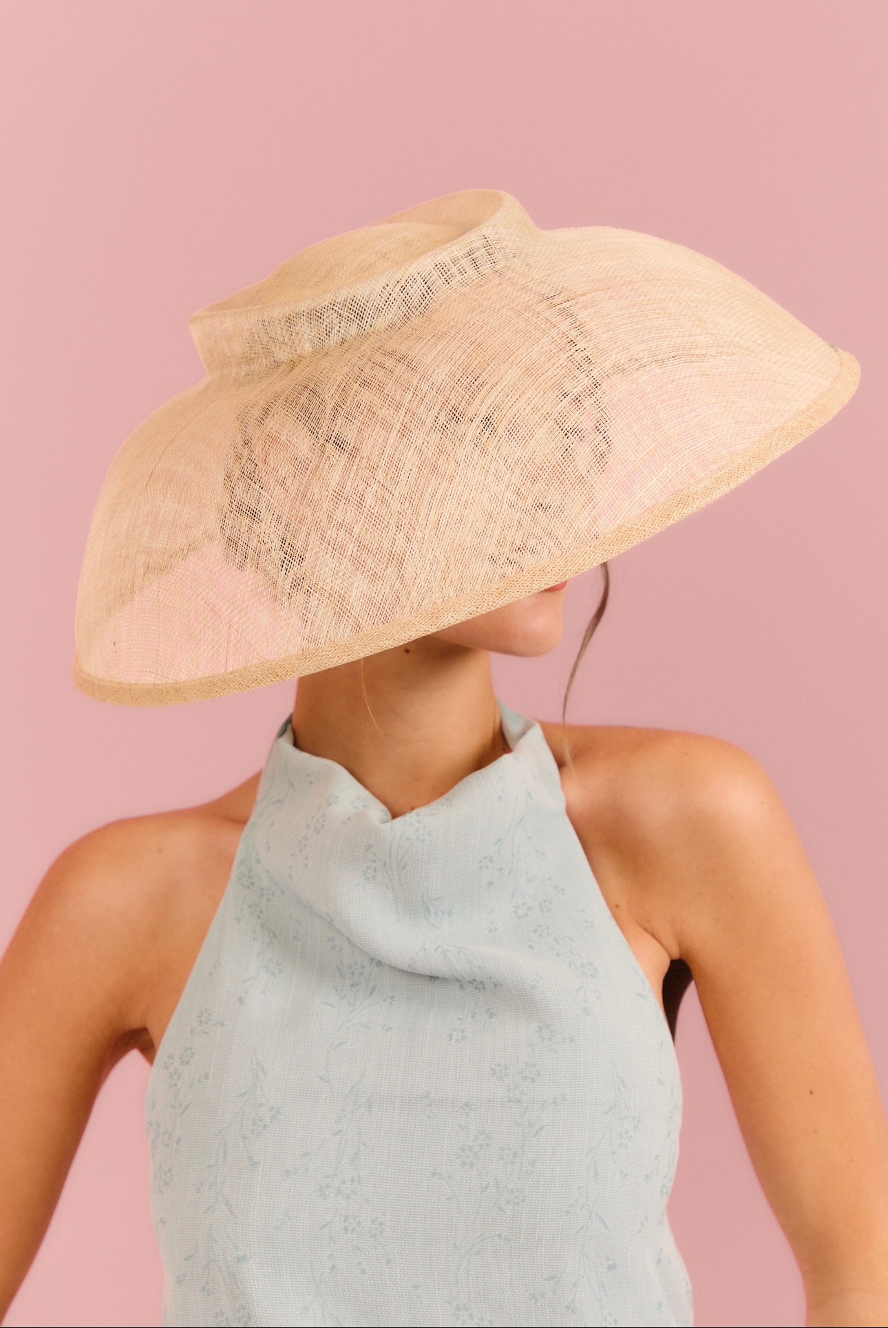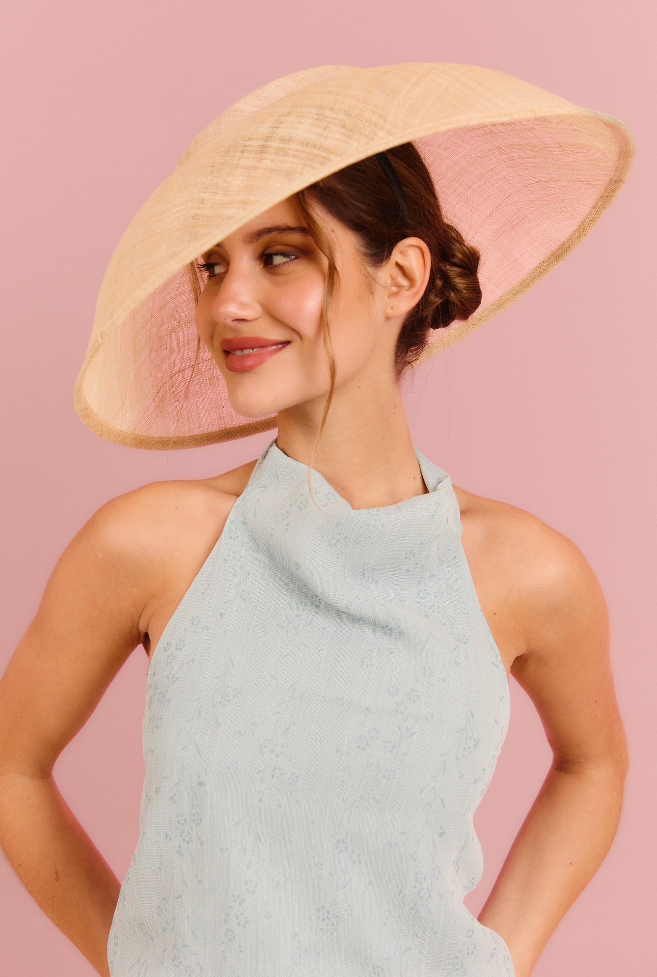 Pamela de sinamay con forma acampanada. Hecha a mano en Madrid. Se sujeta con diadema. Mide 45 x 15 cm