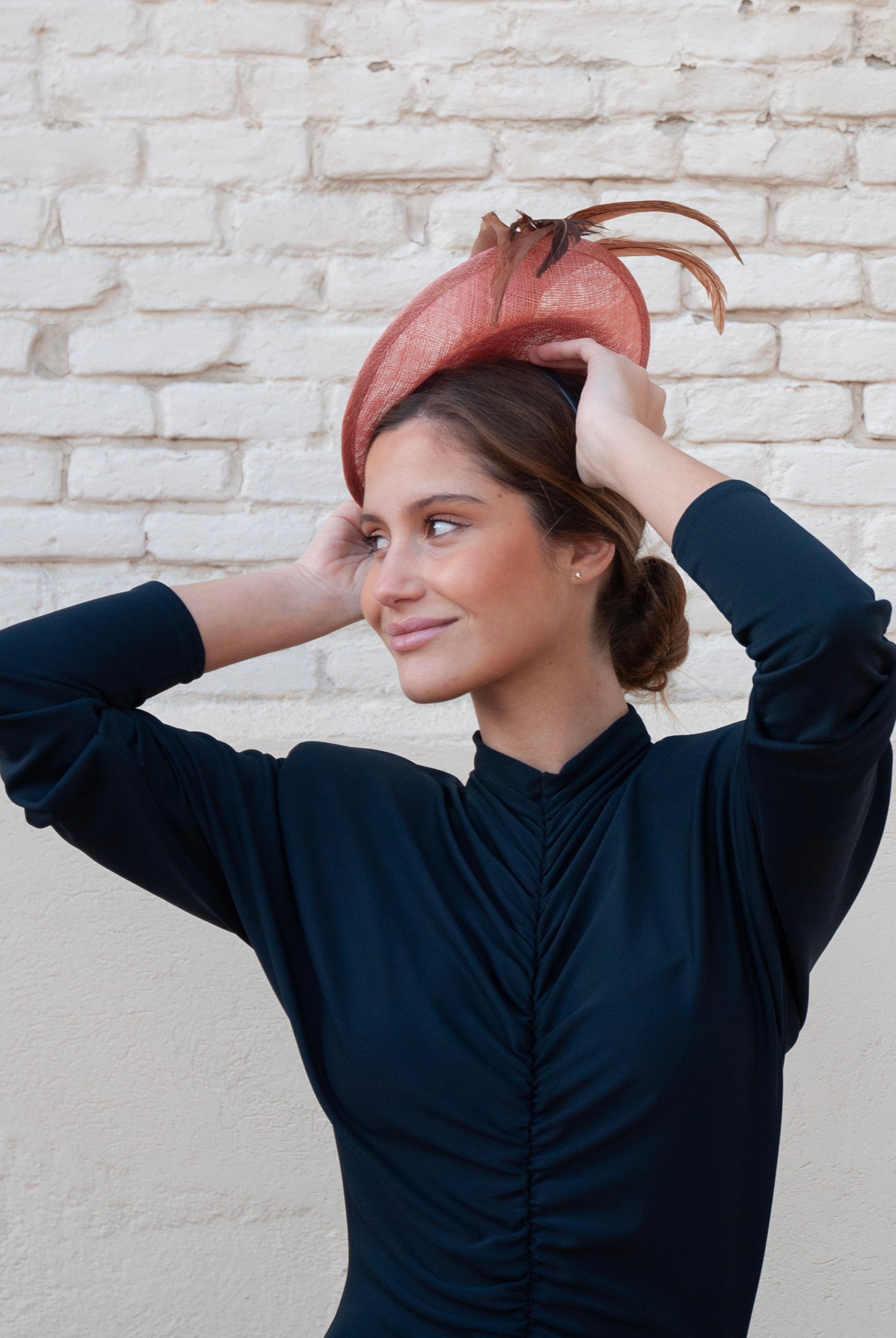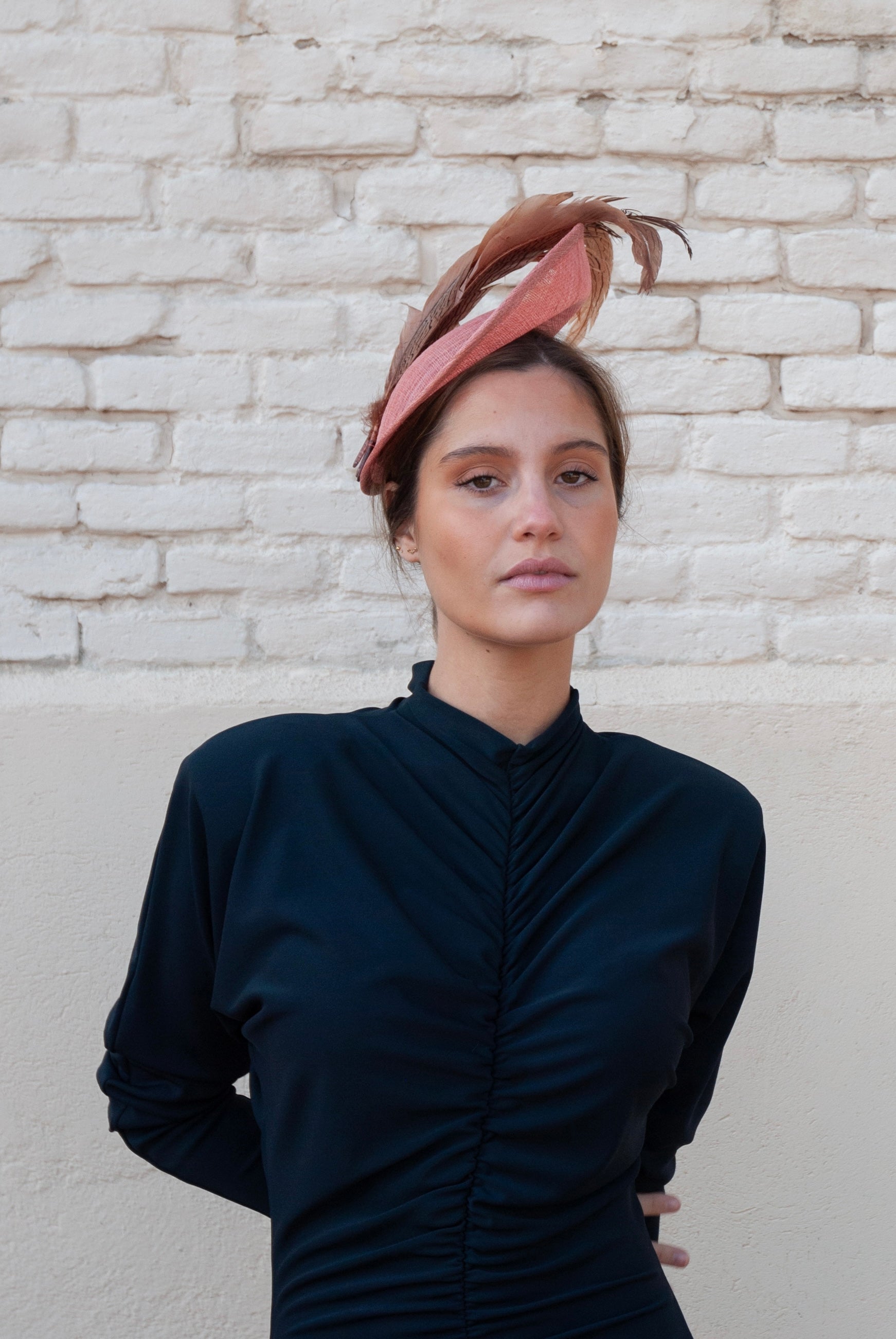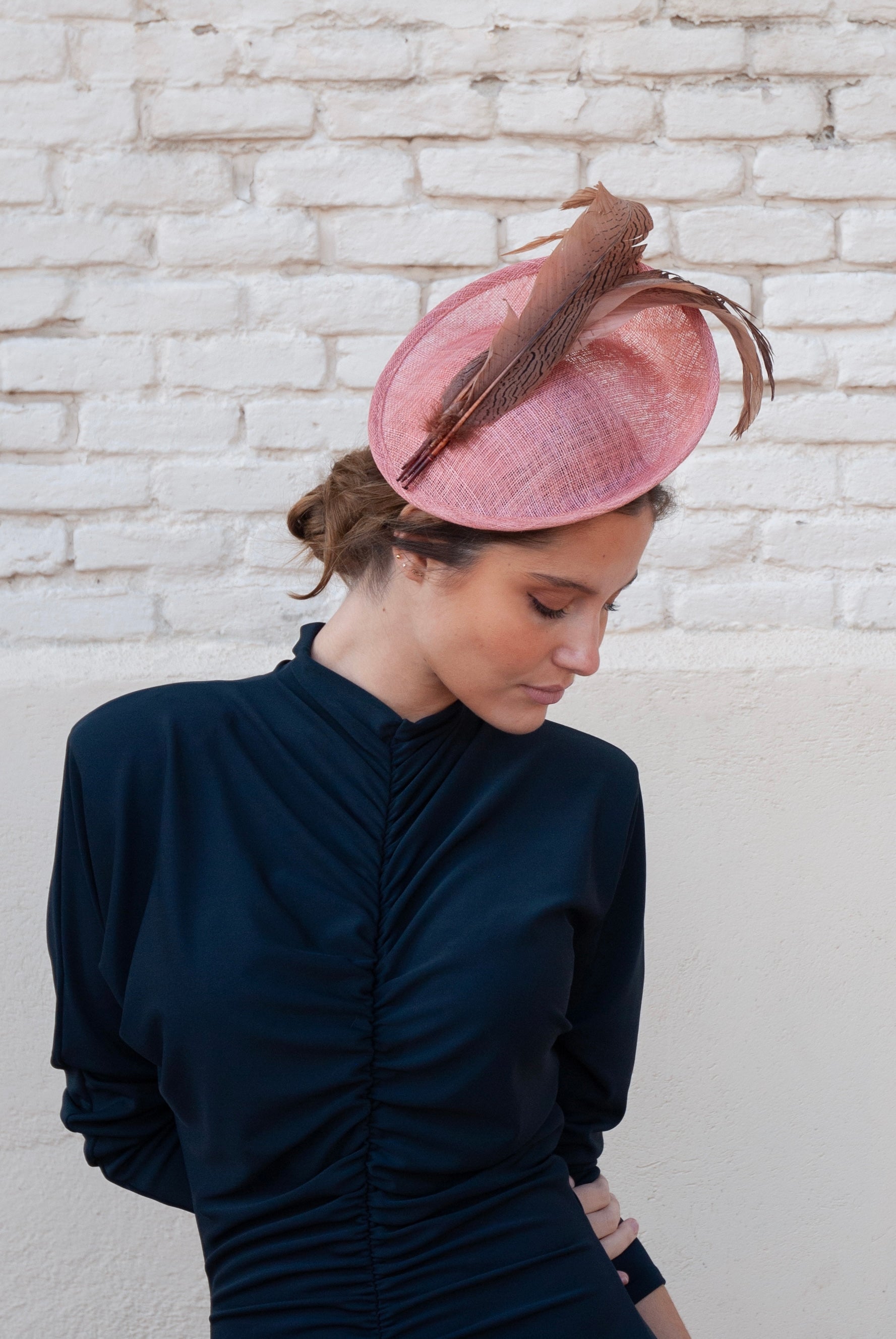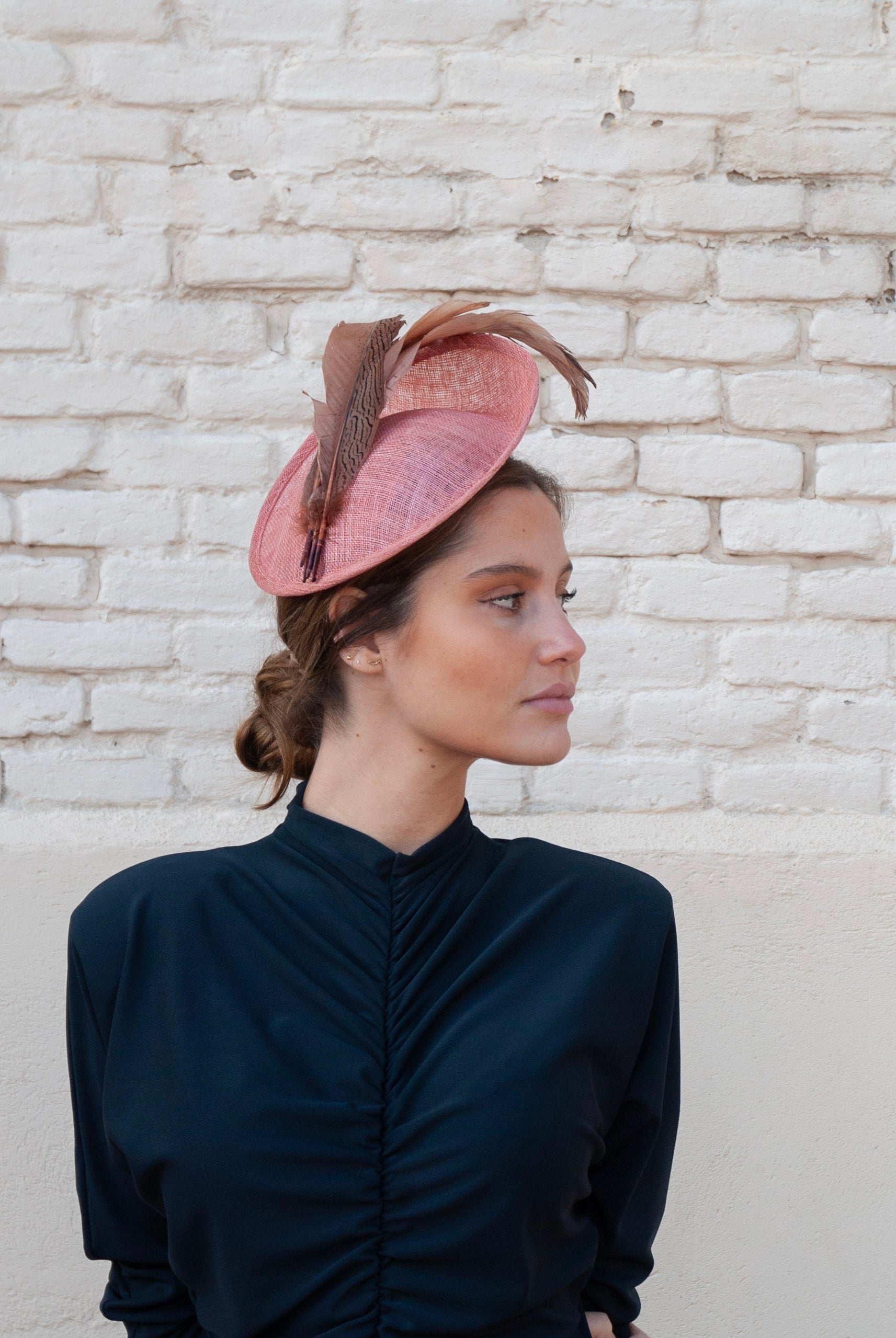 Tocado de sinamay con base en forma de plato adornado con plumas naturales. Hecho a mano en Madrid. Se sujeta con diadema