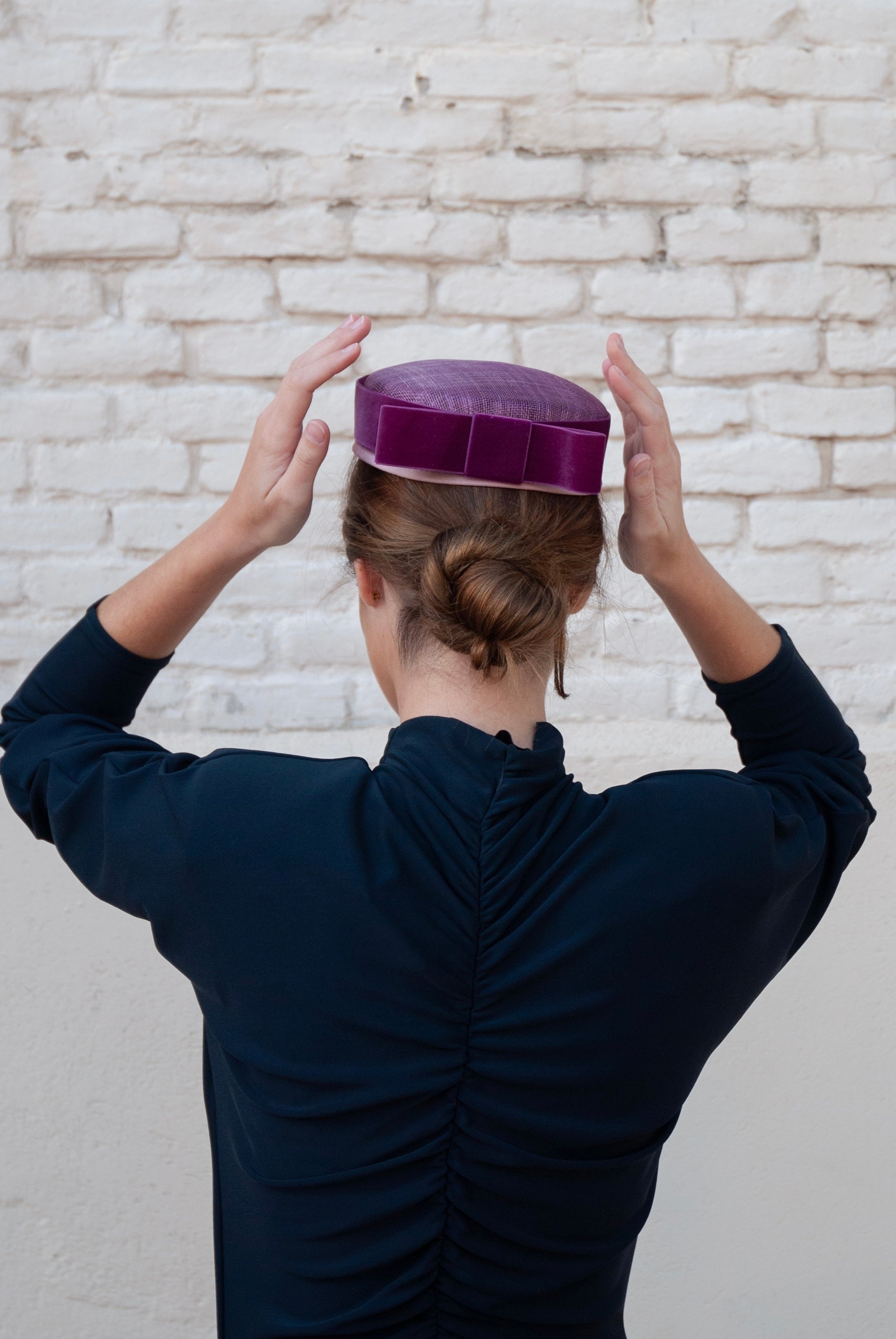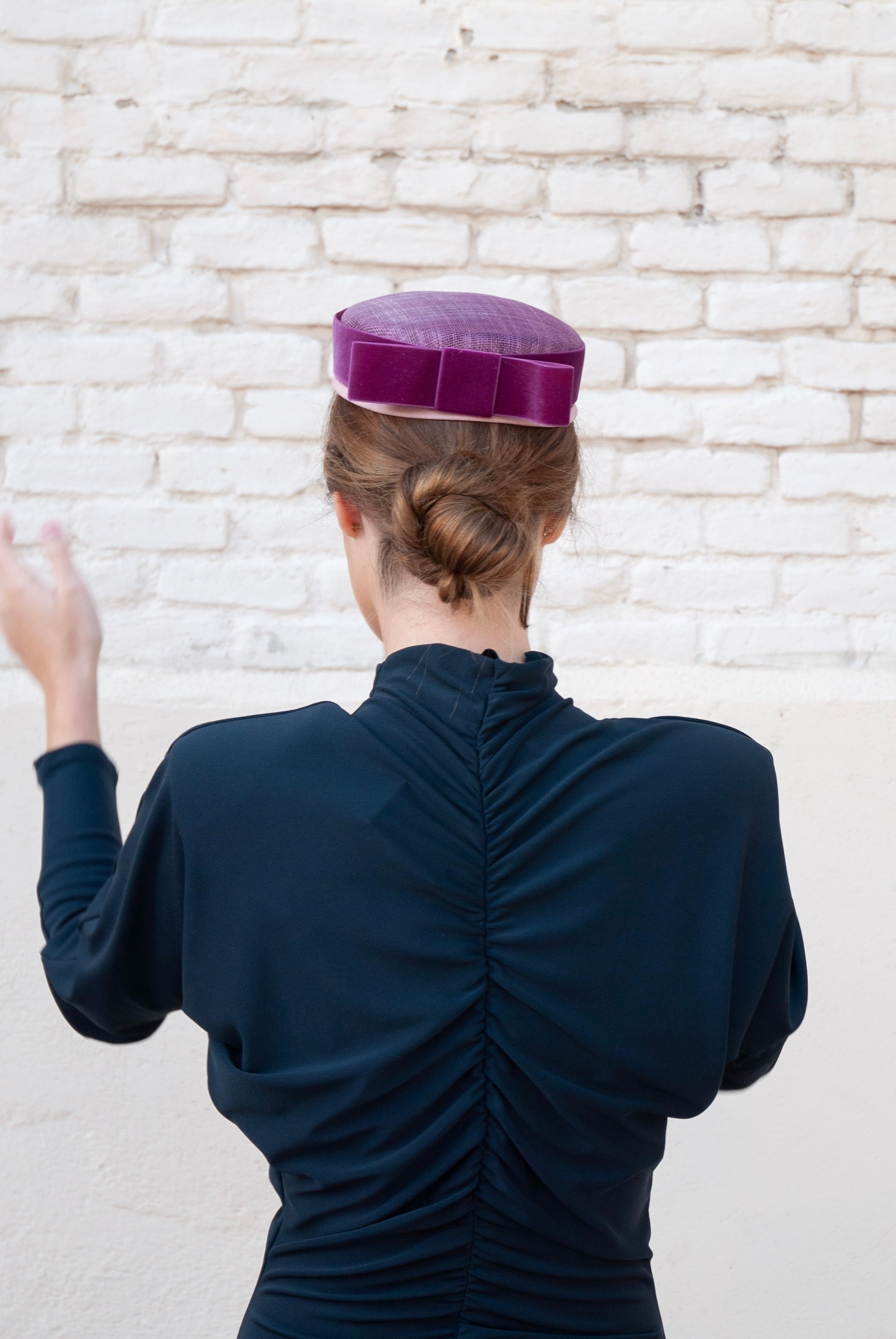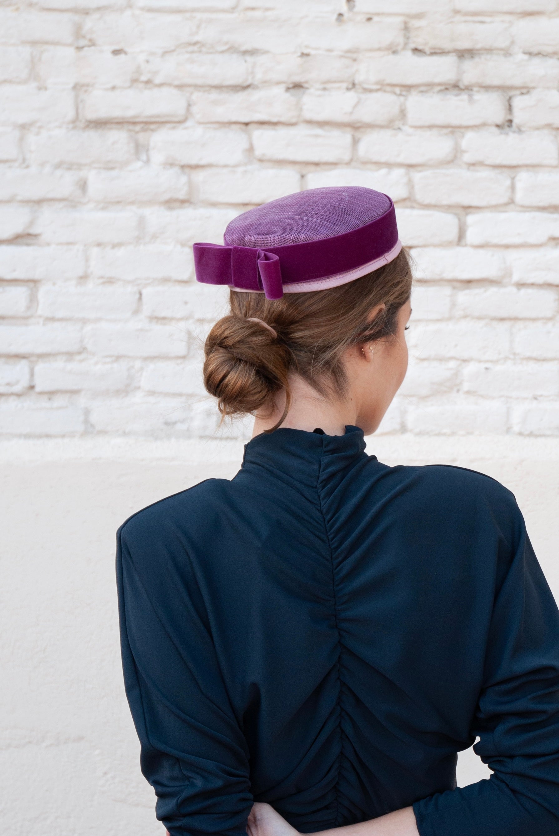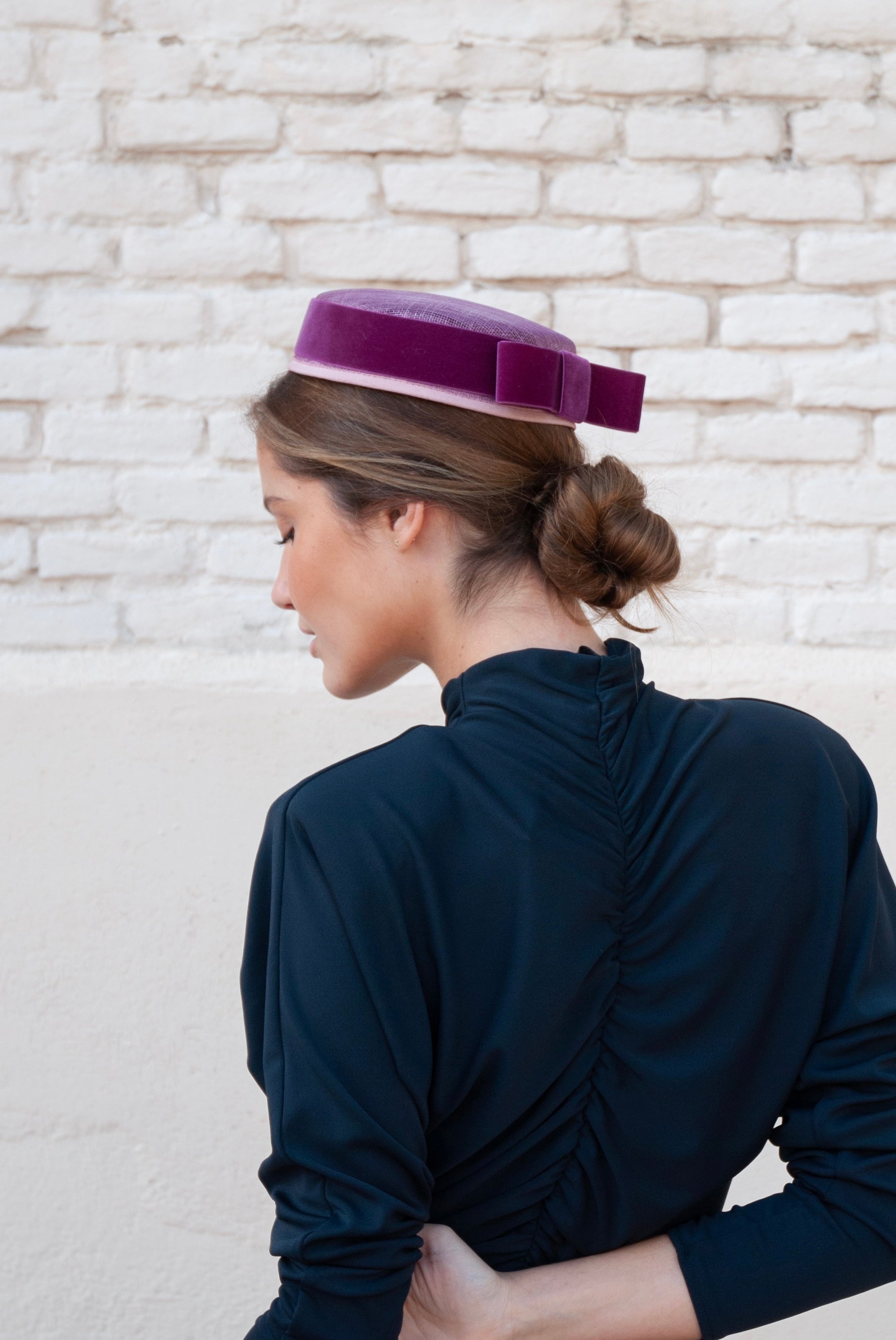 El casquete o pillbox Cintia de sinamay adornado con un lazo de terciopelo, que aporta presencia y sofisticación sin perder naturalidad. Confeccionado artesanalmente en España, el es perfecto para bodas de día o de tarde, comuniones y celebraciones donde cada detalle marca la diferencia