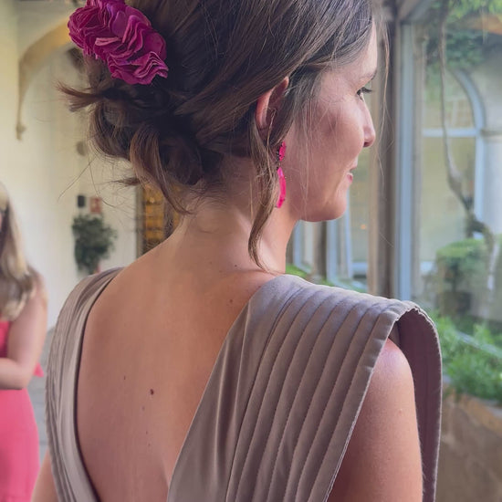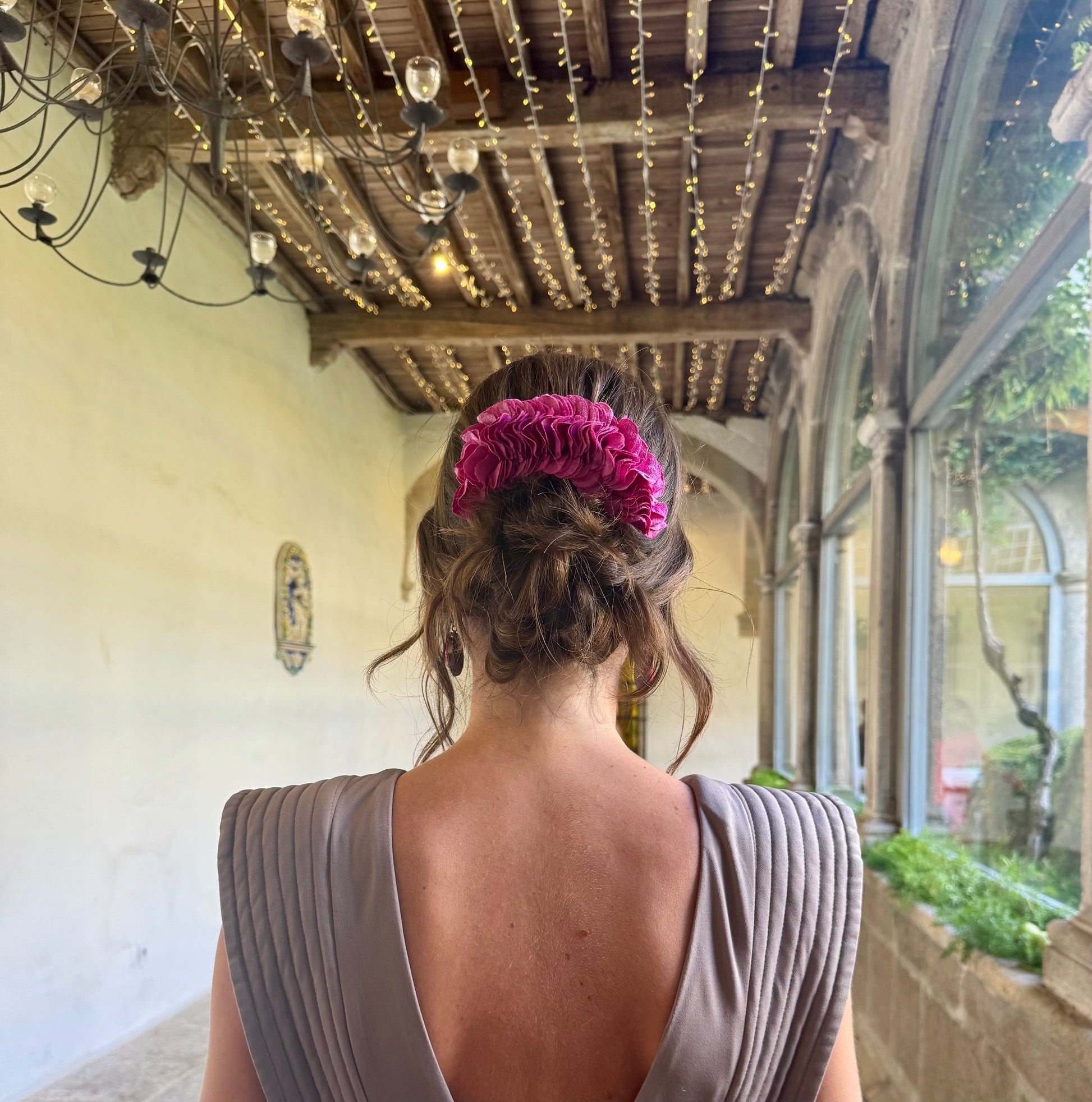 Adorno de pétalos de pétalos de terciopelo ideal para adornar un moño. Está alambrado para facilitar su colocación. Hecho a mano en Madrid.