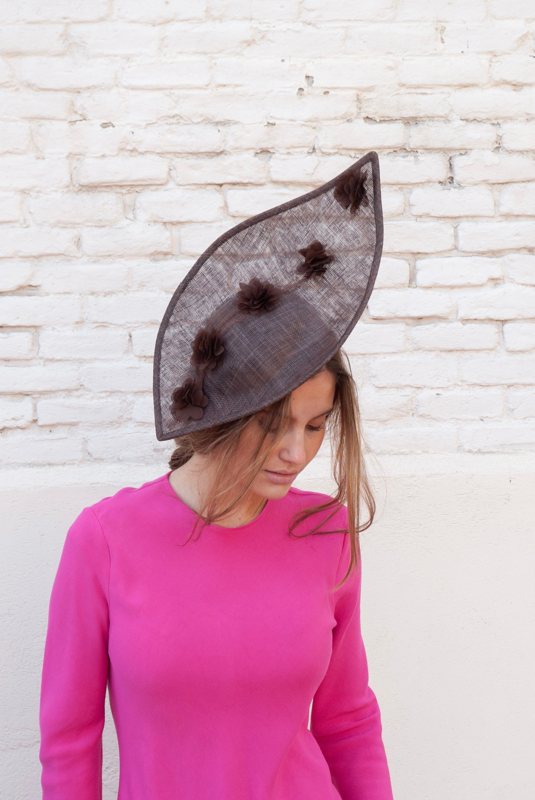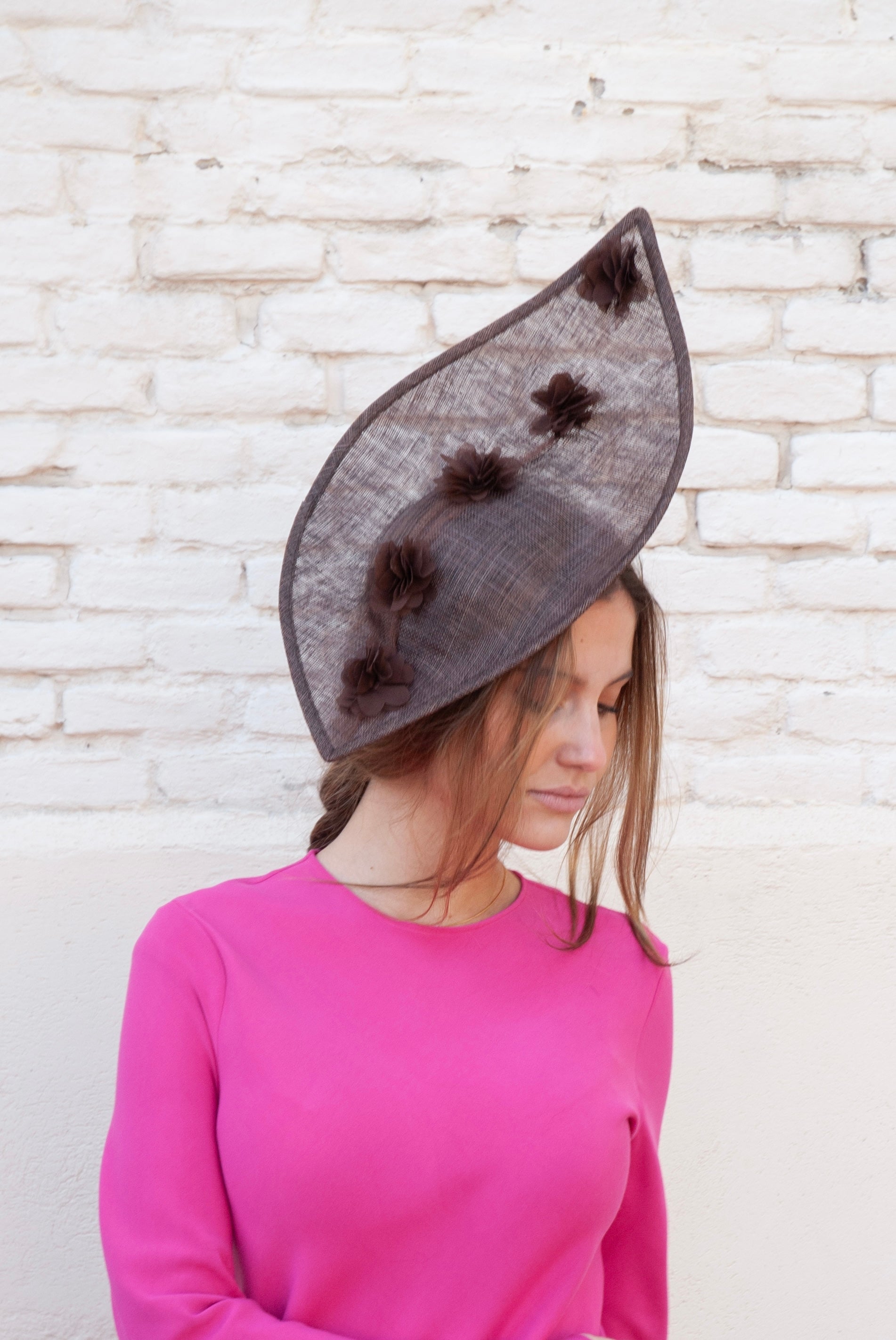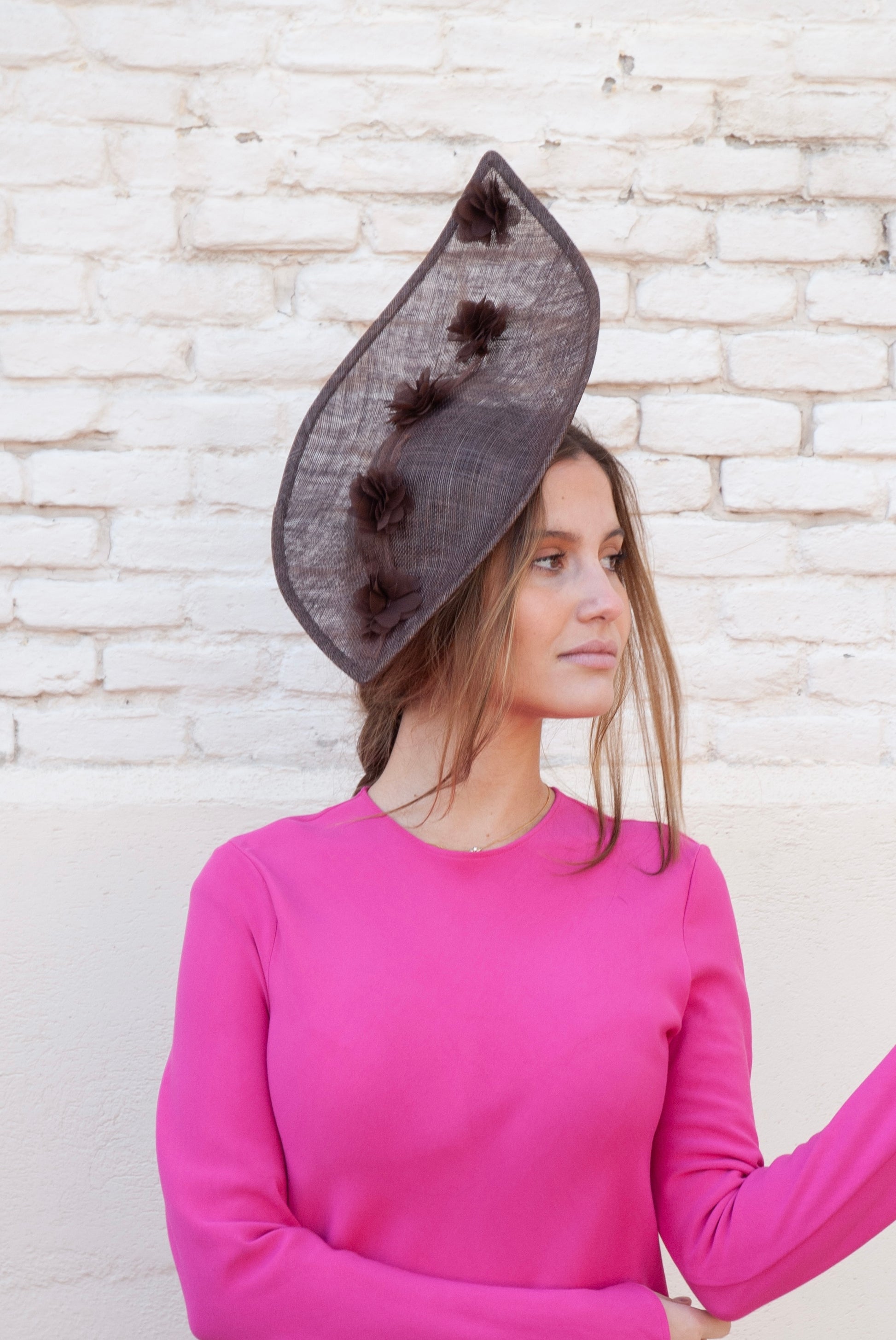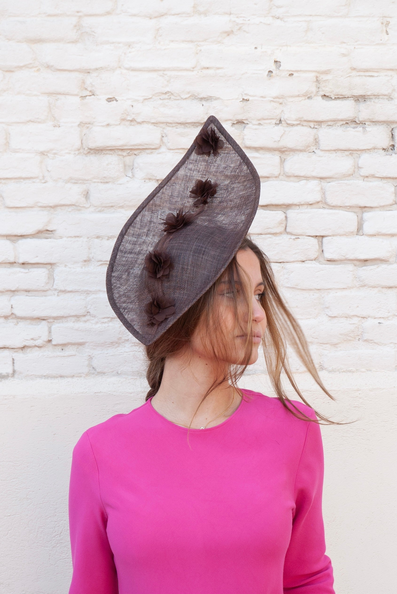 Tocado de sinamay irregular adornado con flores. Se sujeta con diadema. Hecho a mano en España