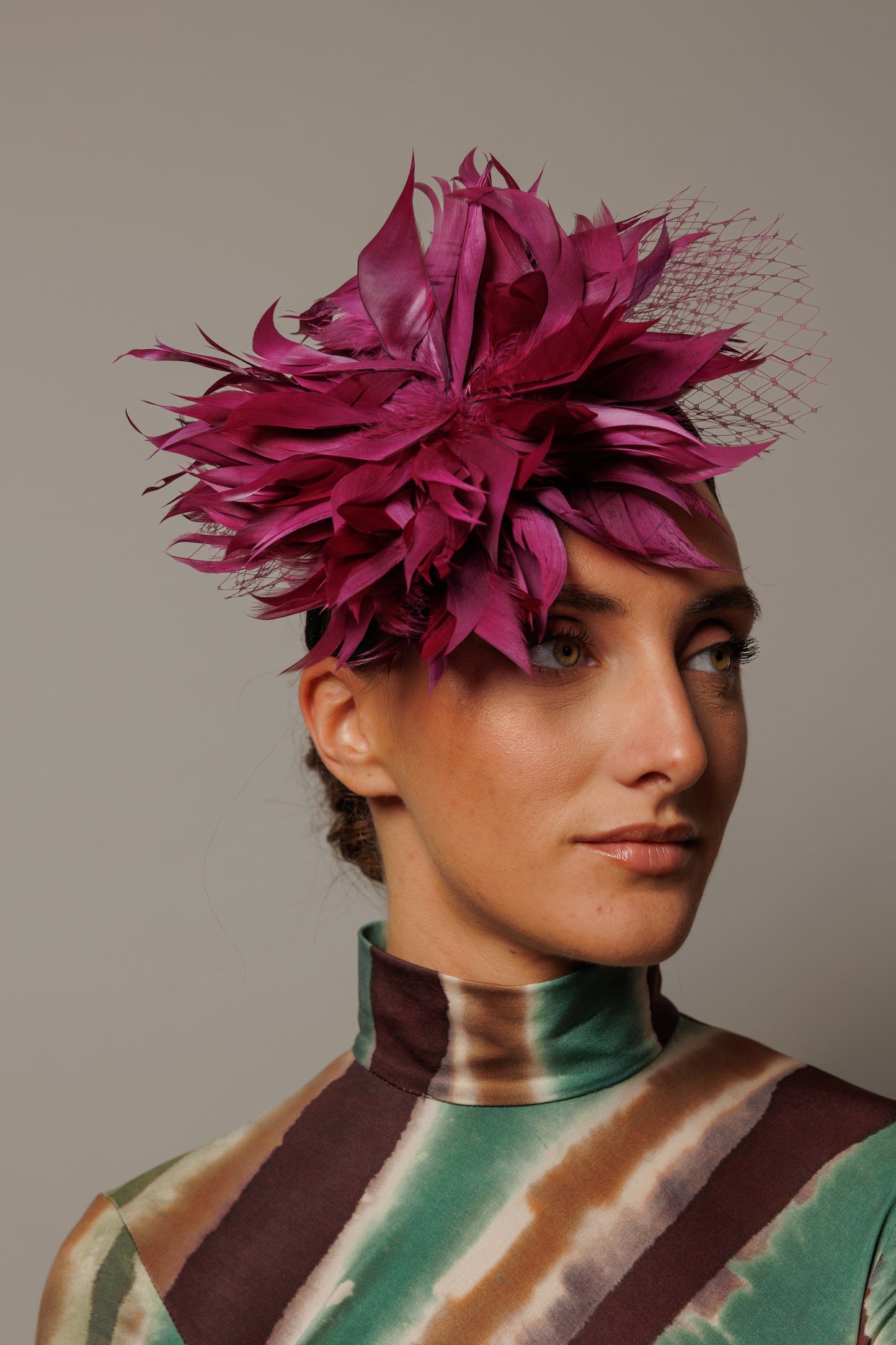 Tocado de flor de plumas color buganvilla. Se sujeta con diadema. Hecho a mano en España