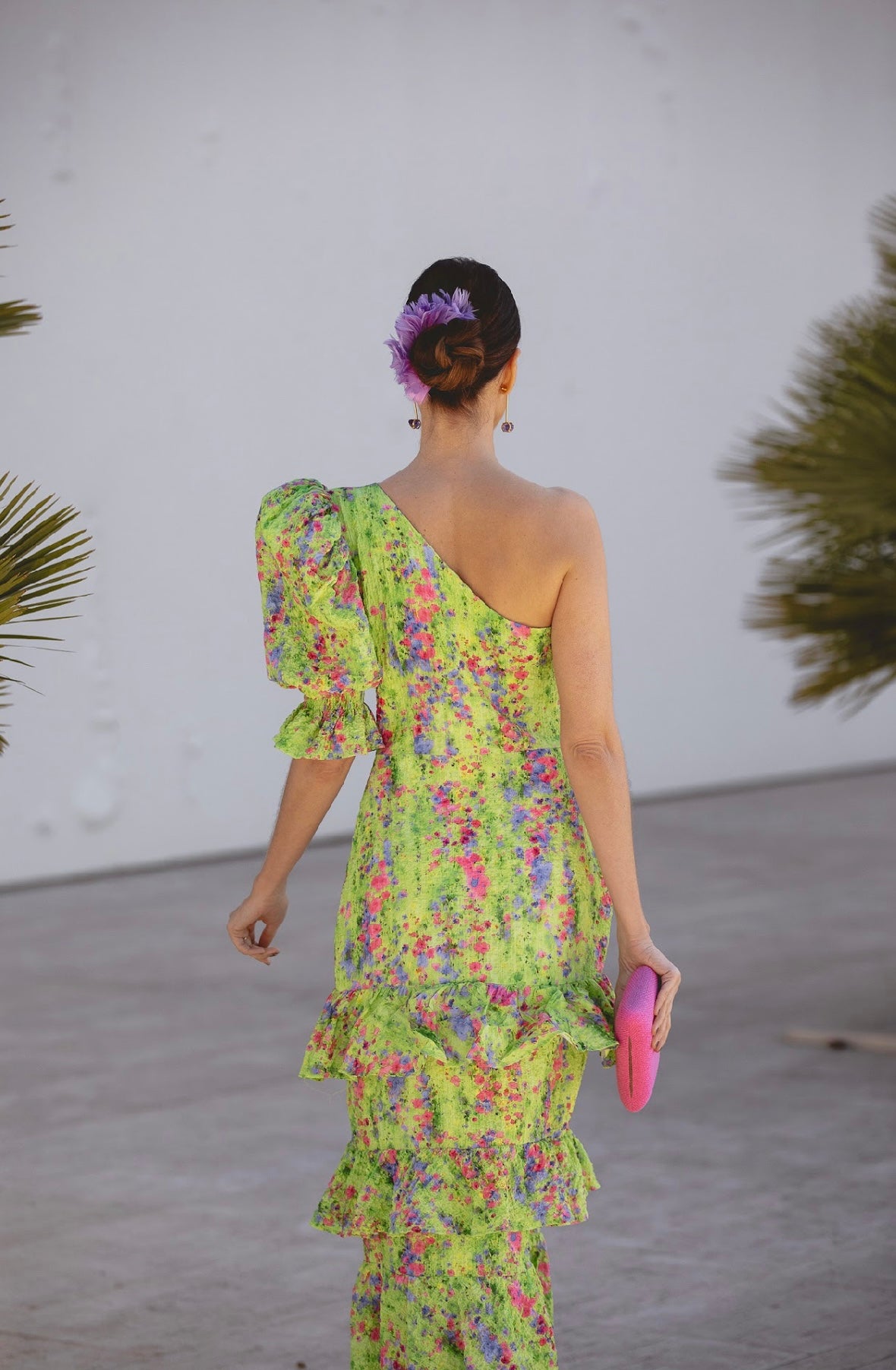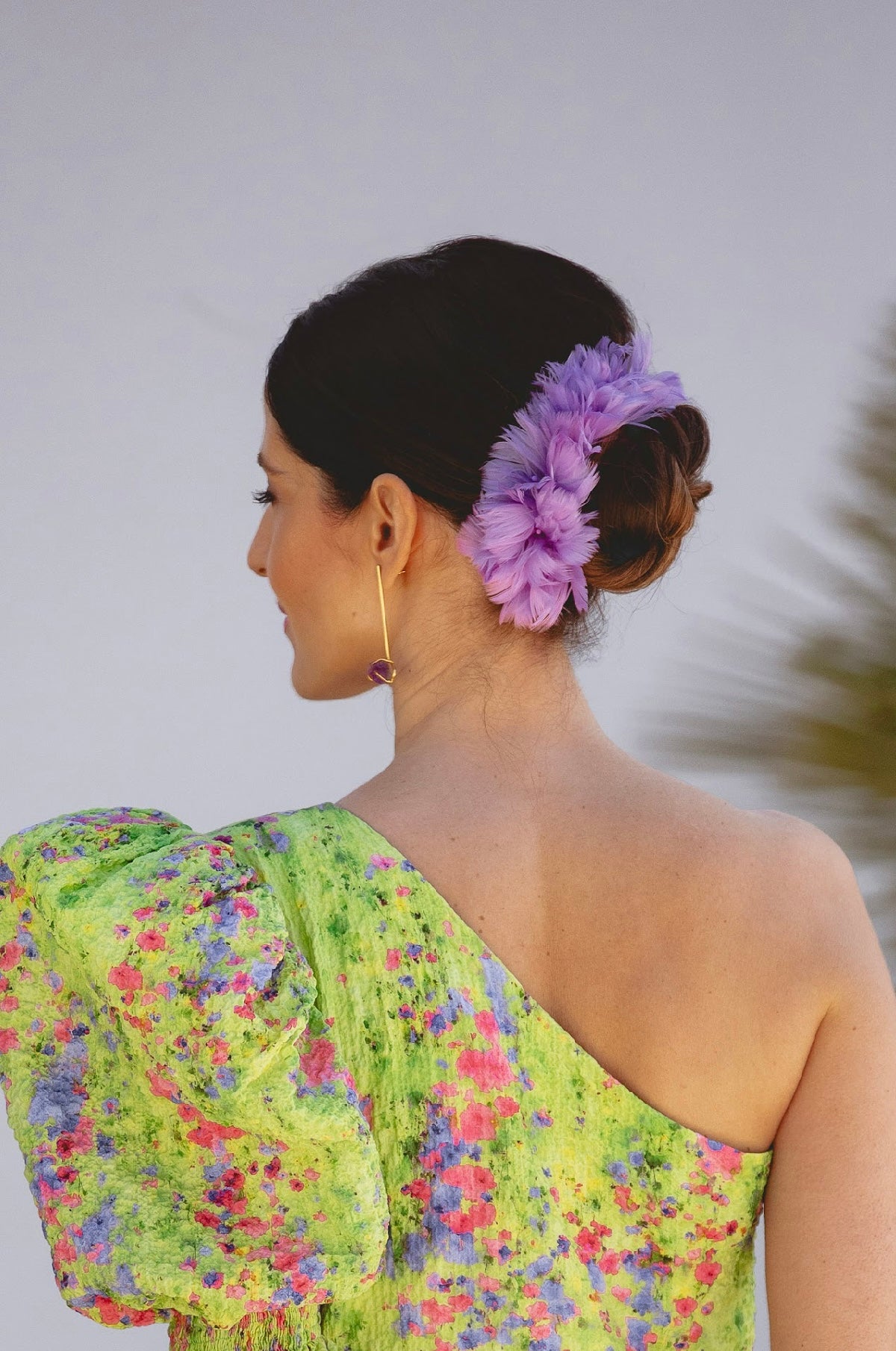 Tocado de plumas lila para colocar adornando un recogido. Hecho a mano en Madrid.