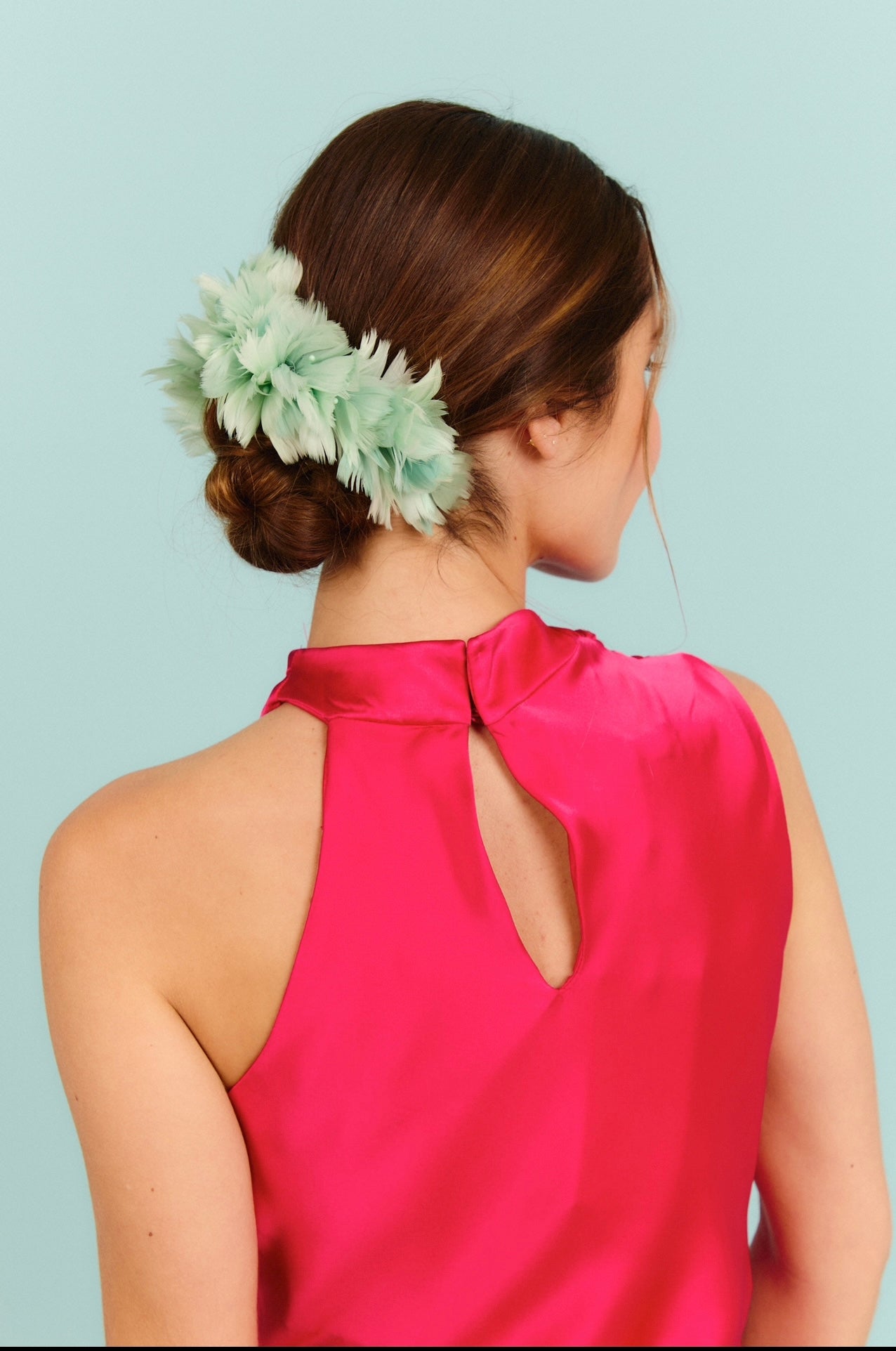 Tocado de plumas verde para colocar adornando un recogido. Hecho a mano en Madrid.